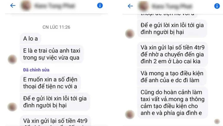 Người tự xưng là em trai tài xế taxi nhắn tin cho anh Trường, ngỏ ý muốn xin lỗi và gửi lại tiền cho 2 nạn nhân.