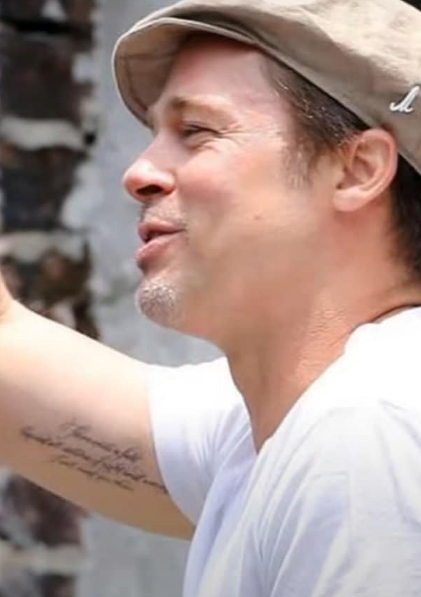 Believed to be one of the first tattoos Brad Pitt got, “Absurdities de I’ Existence” is a French saying that means “Life is absurd”. The seven The actor has a small line on his left forearm, which is only visible when he’s wearing a short-sleeved shirt.