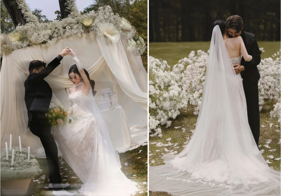 Bộ đôi đầu tư lớn vào bộ ảnh cưới với nhiều hoa tươi. Váy cưới của Bảo Ngọc cũng được thiết kế riêng. Ở phần tà dài hơn 2 m là dòng chữ thêu tinh tế "Until the end of time" cùng tên viết tắt của hai người. Vợ Đạt G chia sẻ bộ ảnh kèm chú thích: "Ở đây hôm nay chính thức có hai con người/ Giàu sang hay sa cơ vẫn luôn giữ môi cười/ Bữa cơm yên vui bên nhau là điều đầu tiên/ Hãy nhớ luôn trao cho nhau nhiều sự hồn nhiên"