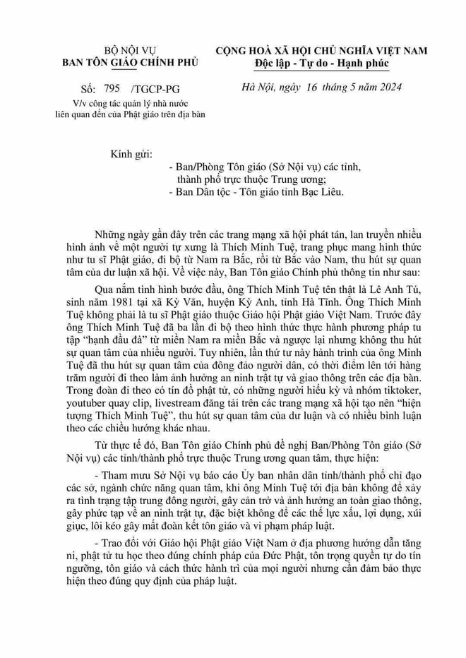 Công văn này nêu: trong những ngày vừa qua, trên mạng xã hội xuất hiện nhiều hình ảnh, clip về người đàn ông mang hình dáng nhà sư bộ hành dọc tuyến đường từ Khánh Hòa ra Hà Giang và ngược lại. Người này được mạng xã hội gọi là “Sư Thích Minh Tuệ”.