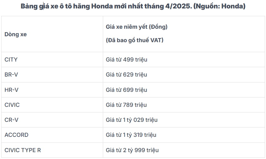 Bảng giá xe ô tô Honda mới nhất tại Việt Nam tháng 4/2025, bảng giá chi tiết nhất sẽ được cập nhật trong bài viết dưới đây.