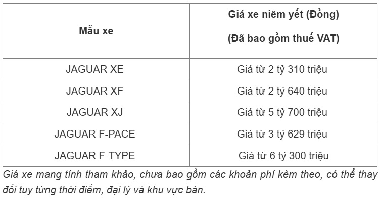 Bảng giá xe ô tô Jaguar mới nhất tại Việt Nam tháng 3/2025, bảng giá chi tiết được cập nhật trong bài viết dưới đây.