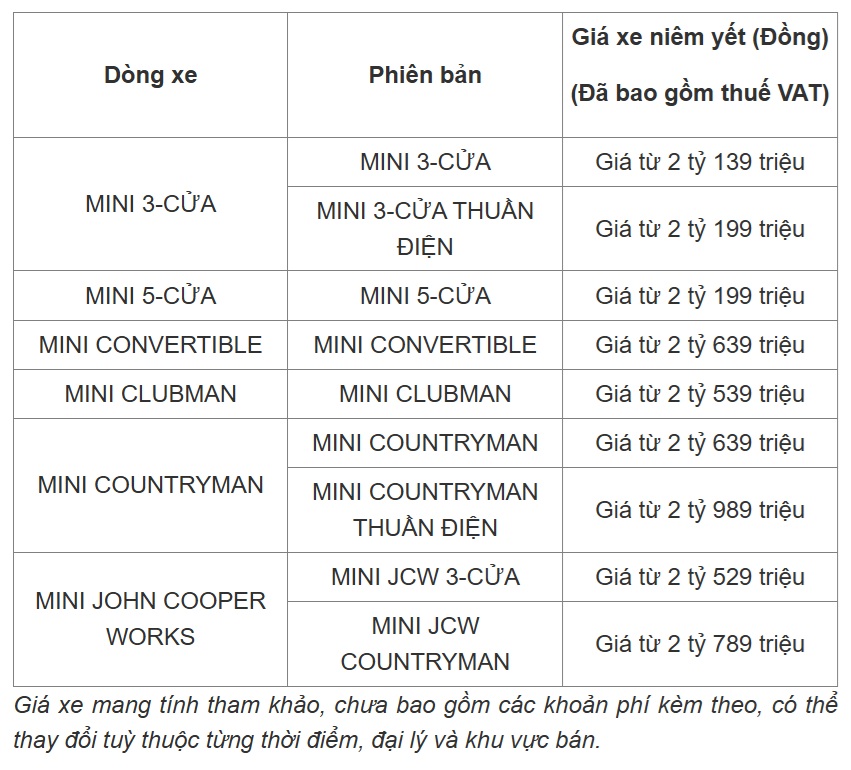 Cập nhật bảng giá xe ô tô Mini mới nhất tại Việt Nam tháng 10/2025 chi tiết trong bài viết dưới đây.