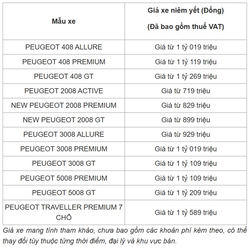 Cập nhật Bảng giá xe ô tô Peugeot mới nhất tại Việt Nam tháng 10/2025 sẽ được cập nhật chi tiết trong bài viết dưới đây.