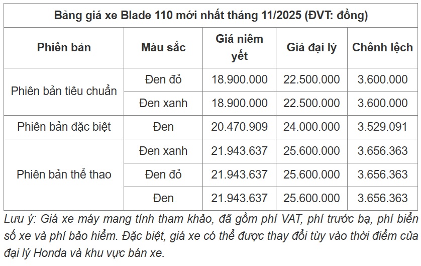 Theo ghi nhận, giá niêm yết xe Honda Blade 110 trong tháng 11/2025 vẫn được giữ nguyên ở mức cũ của tháng trước, cụ thể: Phiên bản tiêu chuẩn đang có giá bán 18.900.000 đồng, phiên bản đặc biệt đang có giá bán 20.470.909 đồng và phiên bản thể thao đang có giá bán 21.943.637 đồng.