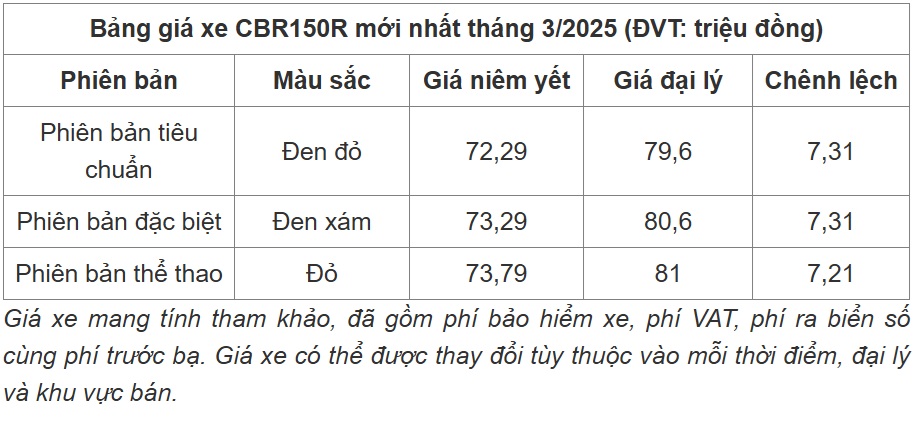 Giá niêm yết của xe Honda CBR150R trong tháng 3 không có sự điều chỉnh nào so với tháng 2. Cụ thể như sau: Bản tiêu chuẩn tiếp tục được duy trì giá bán 72,29 triệu đồng, bản đặc biệt tiếp tục bán 73,29 triệu đồng và bản thể thao tiếp tục được duy trì giá bán 73,79 triệu đồng.