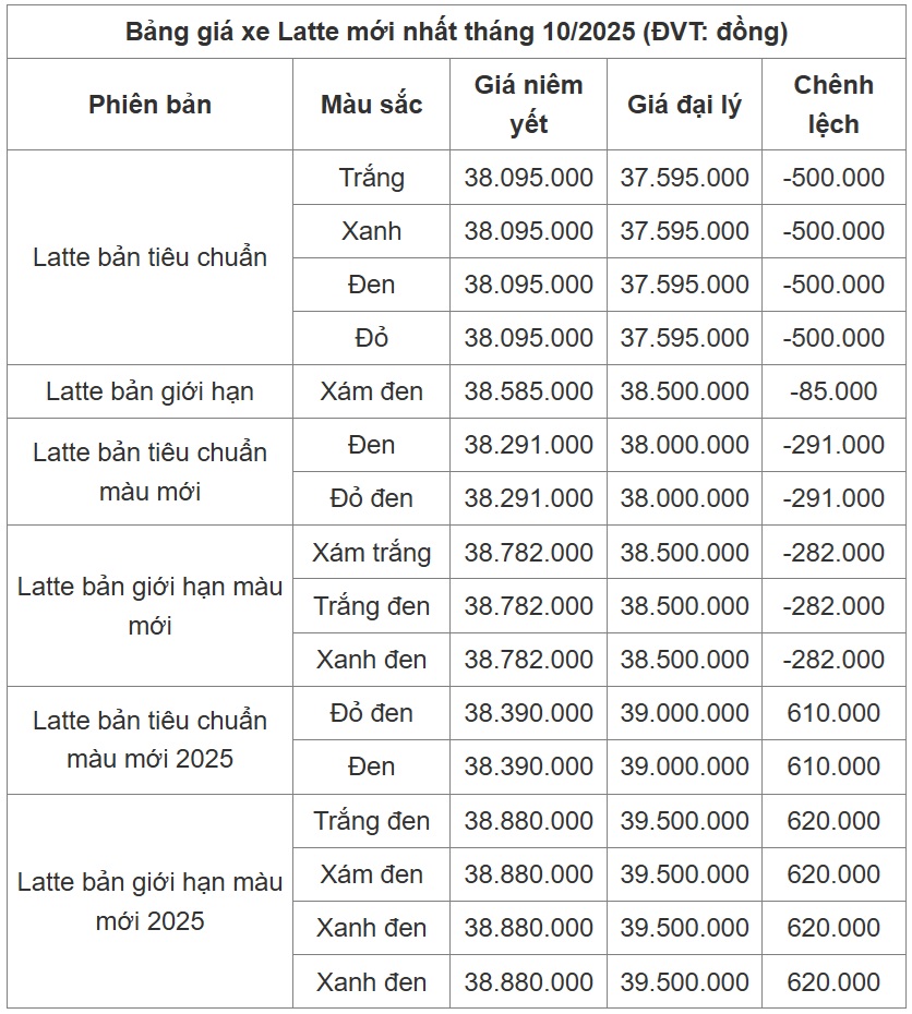 Giá niêm yết của xe Yamaha Latte trong tháng 10 này không có sự thay đổi nào so với tháng 9/2025, cụ thể: Phiên bản tiêu chuẩn được bán với giá 38.095.000 đồng và phiên bản giới hạn được bán với giá 38.585.000 đồng.
