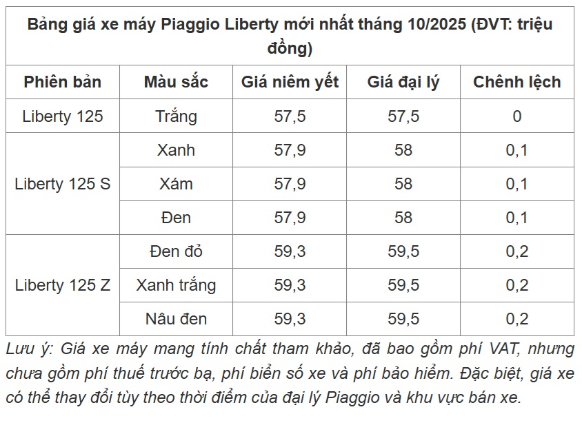 So với tháng 9, giá niêm yết của xe Piaggio Liberty trong tháng 10/2025 vẫn được duy trì ở mức cũ, cụ thể: Liberty 125 đang được bán ở mức giá 57,5 triệu đồng, Liberty 125 S đang được bán ở mức giá 57,9 triệu đồng và Liberty 125 Z đang được bán ở mức giá 59,3 triệu đồng.