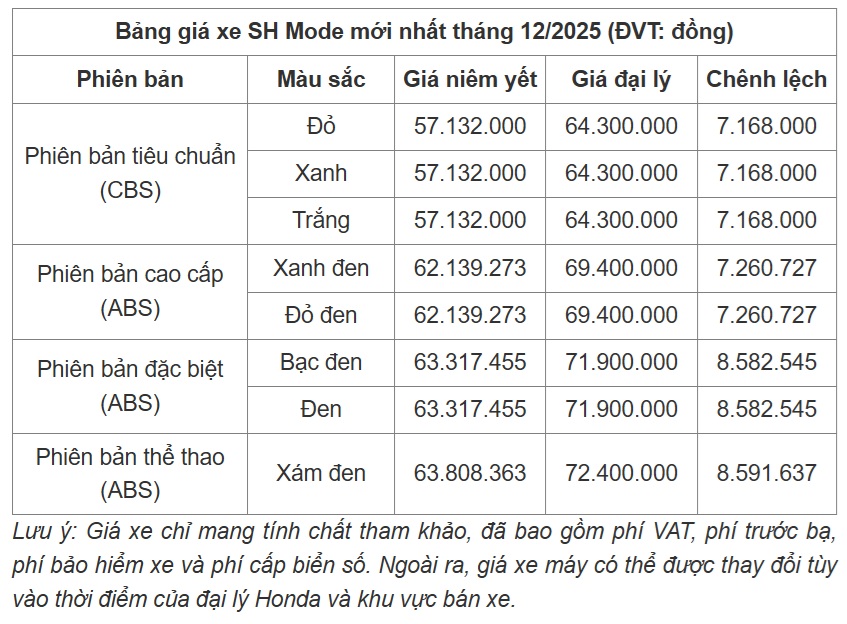 So với tháng trước, giá niêm yết của xe Honda SH Mode trong tháng 12/2025 vẫn ổn định, cụ thể: Phiên bản tiêu chuẩn đang có mức giá bán 57.132.000 đồng, phiên bản cao cấp đang có mức giá bán 62.139.273 đồng, phiên bản đặc biệt đang có mức giá bán 63.317.455 đồng và phiên bản thể thao đang có mức giá bán 63.808.363 đồng.