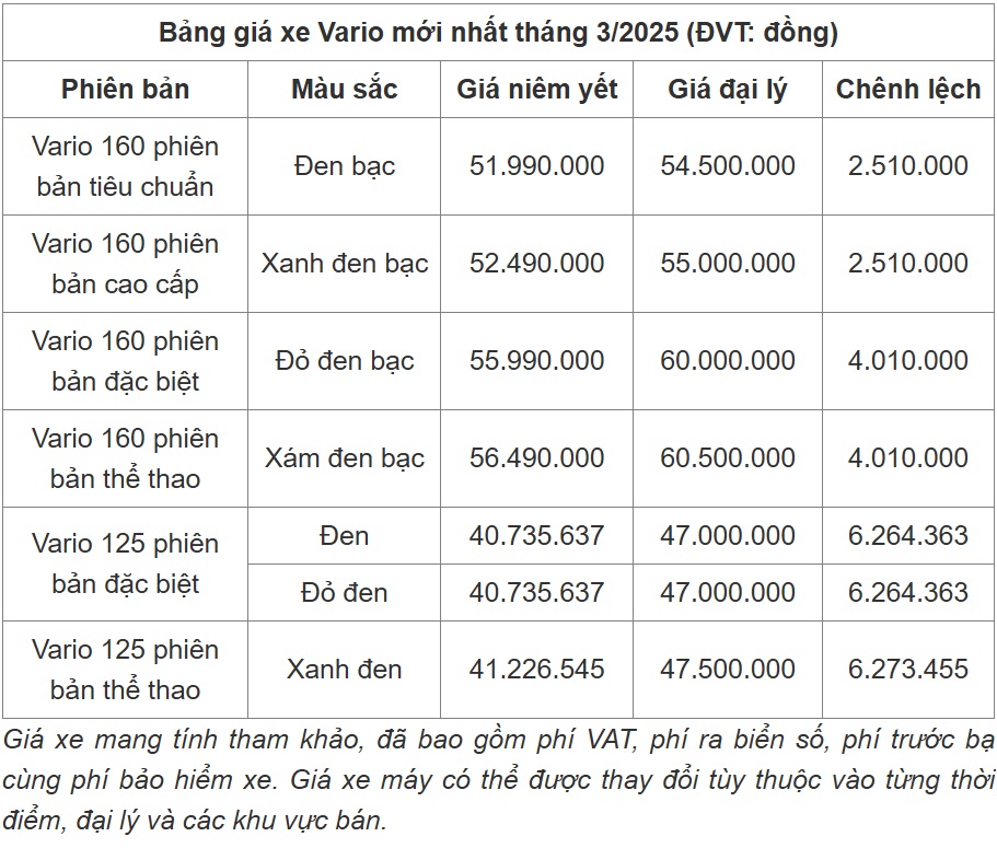 Bảng giá xe Vario mới nhất tháng 3/2025 tại các đại lý trên cả nước, bảng giá chi tiết nhất sẽ được cập nhật trong bài viết dưới đây.