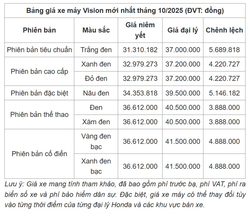 Giá niêm yết của xe máy Honda Vision trong tháng 10 này không có sự điều chỉnh nào so với tháng 9, cụ thể: Phiên bản tiêu chuẩn đang có giá 31.310.182 đồng, phiên bản cao cấp đang có giá 32.979.273 đồng, phiên bản đặc biệt đang có giá 34.353.818 đồng, phiên bản thể thao đang có giá 36.612.000 đồng và phiên bản cổ điển đang có giá 36.612.000 đồng.