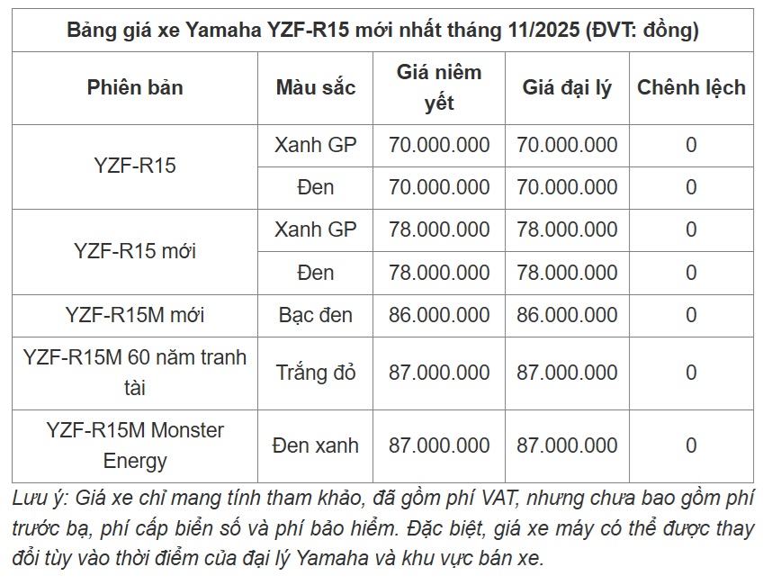So với tháng 10, giá niêm yết của xe Yamaha YZF-R15 trong tháng 11/2025 tiếp tục ổn định, cụ thể: Mẫu xe YZF-R15 vẫn đang có giá bán trong khoảng từ 70.000.000 - 78.000.000 đồng và mẫu xe YZF-R15M vẫn đang có giá bán trong khoảng từ 86.000.000 - 87.000.000 đồng.