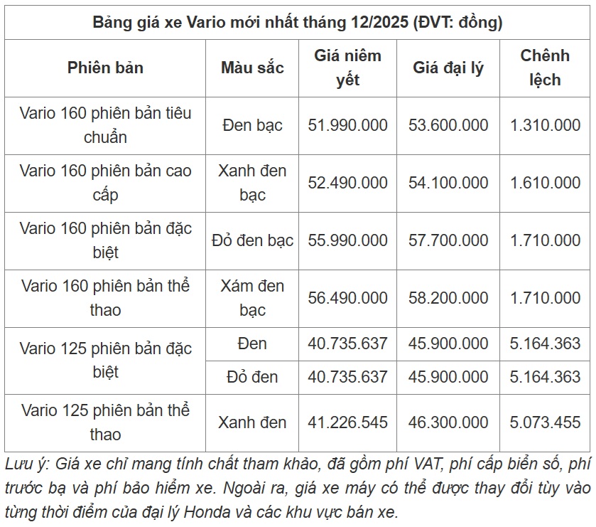 Bảng giá xe máy Vario mới nhất tháng 12/2025 tại các đại lý trên cả nước, bảng giá chi tiết sẽ được cập nhật trong bài viết dưới đây.