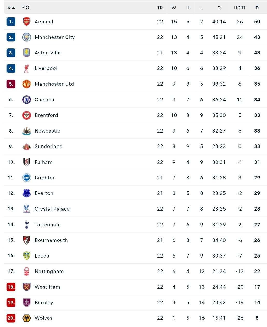 Bảng xếp hạng Ngoại hạng Anh vòng 22