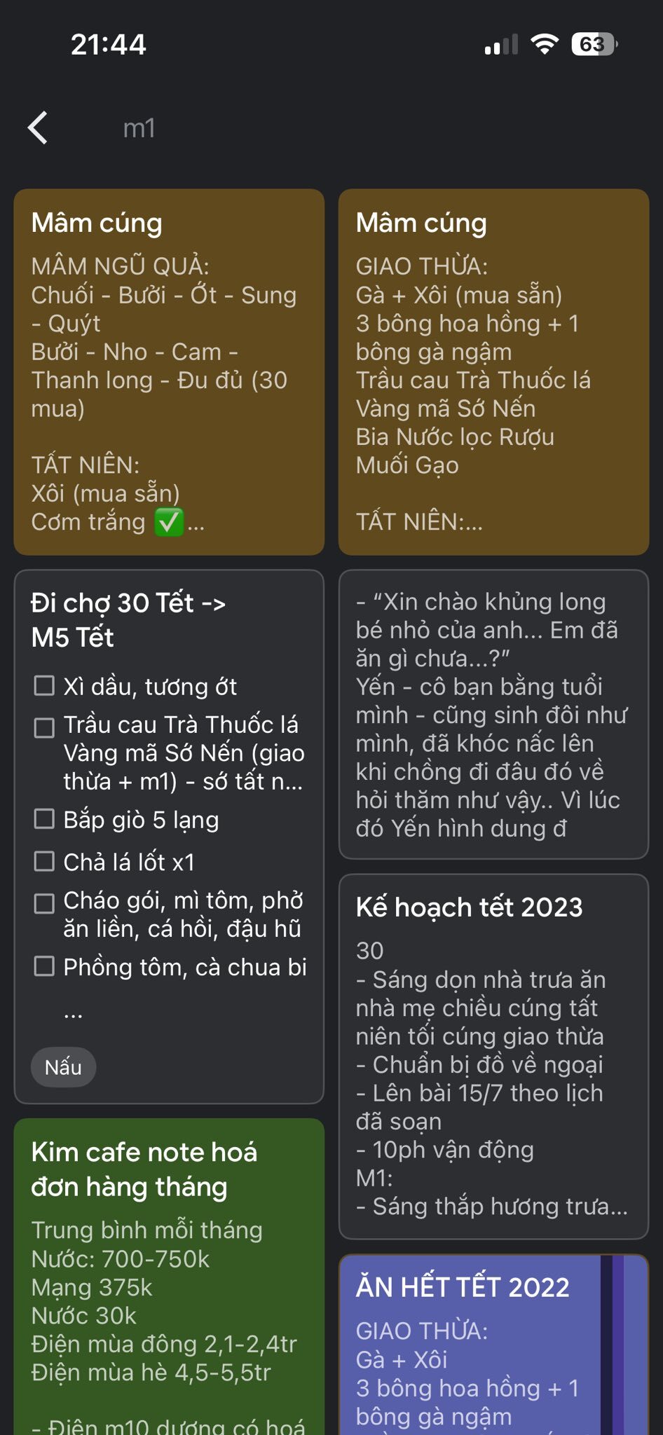 “Nếu vừa đi chợ vừa nghĩ xem nấu gì thì rất mất thời gian. Có khi mua rau ở hàng này xong, sang hàng khác lại nảy ra món mới rồi phải quay lại mua thêm. Tôi luôn lên danh sách sẵn trong điện thoại, lưu trên Google Keep hoặc phần Ghi chú. Hằng năm chỉ cần tìm ‘23 Tết’ hay ‘mùng 1 Tết' là ra ngay, chỉ mất khoảng 5 phút chỉnh sửa lại cho phù hợp”, chị chia sẻ.