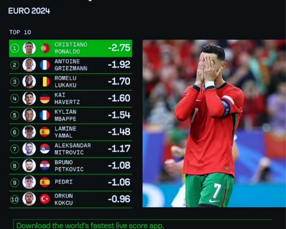 Theo đánh giá của Sofascore, tiền đạo Al-Nassr là cầu thủ phung phí nhiều cơ hội nhất tại EURO 2024. Chưa ghi bàn nào, song chỉ số bàn thắng kỳ vọng của Ronaldo là 2.75, cao hơn Romelu Lukaku (1.7) - người 3 lần bị VAR từ chối bàn thắng.