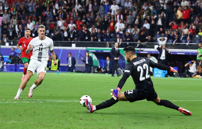 Sau khi Oblak cản được quả penalty hiểm hóc của Ronaldo, Slovenia sở hữu một tình huống ngon ăn không kém. Trung vệ 41 tuổi Pepe mắc sai lầm chuyền hụt ở phút 115, tạo cơ hội đối mặt cho Benjamin Sesko. Thủ môn Diogo Costa sửa sai cho đồng đội, bằng việc dùng chân cản cú cứa lòng của tiền đạo Slovenia. Pha cứu thua có giá trị chẳng khác nào một bàn thắng, gợi nhớ tình huống cản phá của Emiliano Martinez khi đối đầu với Randal Kolo Muani ở chung kết World Cup 2022.
