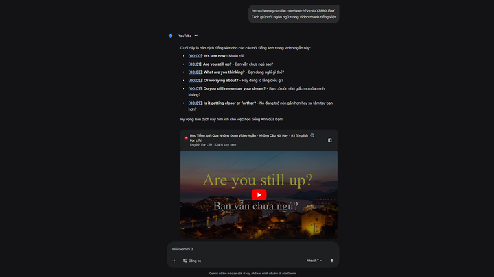 Chỉ sau vài giây xử lý, Gemini sẽ trả về bản dịch được chia theo từng đoạn nội dung, đi kèm thời gian tương ứng trong video. Cách trình bày này giúp bạn dễ theo dõi, đối chiếu và sử dụng cho nhiều mục đích khác nhau như học tập, làm phụ đề hay tổng hợp nội dung.