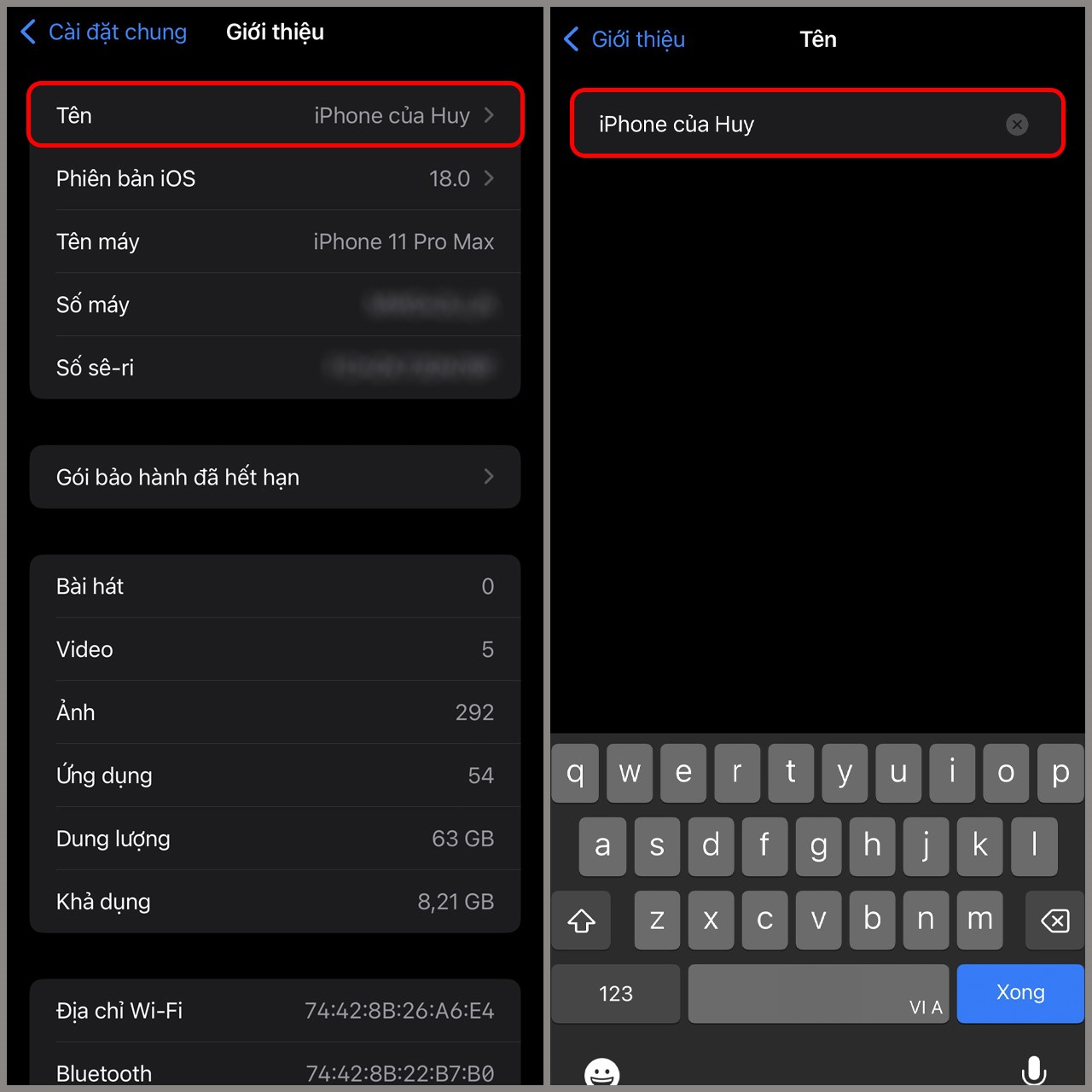 Bước 2. Chọn Tên, xóa tên hiện tại và đổi lại tên mới mà bạn muốn, nhấn Xong để lưu thay đổi.