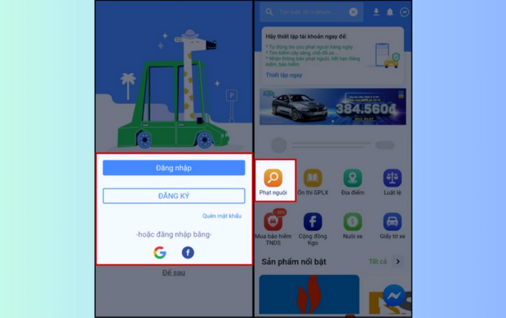 Bước 2. Sau khi tải xuống hoàn tất > Mở ứng dụng và đăng ký/đăng nhập tài khoản, bạn cũng có thể đăng nhập nhanh chóng bằng tài khoản Google hoặc Facebook > Trong trang chủ, bạn nhấn chọn mục Phạt nguội để tiến hàng tra cứu.