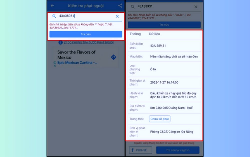Bước 2: Sau đó bạn nhấn Tra cứu để xem mình có vi phạm lỗi giao thông không nhé > Hệ thống sẽ hiển thị thông tin liên quan về lỗi vi phạm, thời gian và số điện thoại liên hệ để nộp phạt.