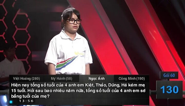 Ngay trong đề bài đã nêu rất rõ sự chênh lệch giữa tổng tuổi của 4 anh em và tuổi của mẹ, yêu cầu tìm số năm để 2 dữ kiện bằng nhau. Ở trong bài toán này, chỉ cần áp dụng các phép tính đã học ở tiểu học để thực hiện, tuy nhiên vẫn có nhiều người và cả thí sinh Olympia trả lời sai.