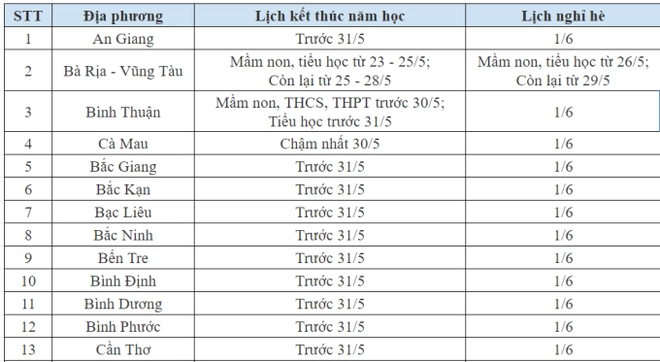 Theo Quyết định 2171/QĐ-BGDĐT về khung kế hoạch thời gian năm học 2023-2024 đối với giáo dục mầm non, giáo dục phổ thông và giáo dục thường xuyên do Bộ Giáo dục và Đào tạo ban hành, hoàn thành kế hoạch giáo dục học kỳ II trước ngày 25/5/2024 và kết thúc năm học trước ngày 31/5/2024; xét công nhận hoàn thành chương trình tiểu học và xét công nhận tốt nghiệp trung học cơ sở trước ngày 30/6/2024, hoàn thành tuyển sinh các lớp đầu cấp trước ngày 31/7/2024. Như vậy, học sinh 63 tỉnh, thành sẽ kết thúc năm học muộn nhất trước ngày 31/5/2024 và được nghỉ hè sớm nhất từ 25/5.