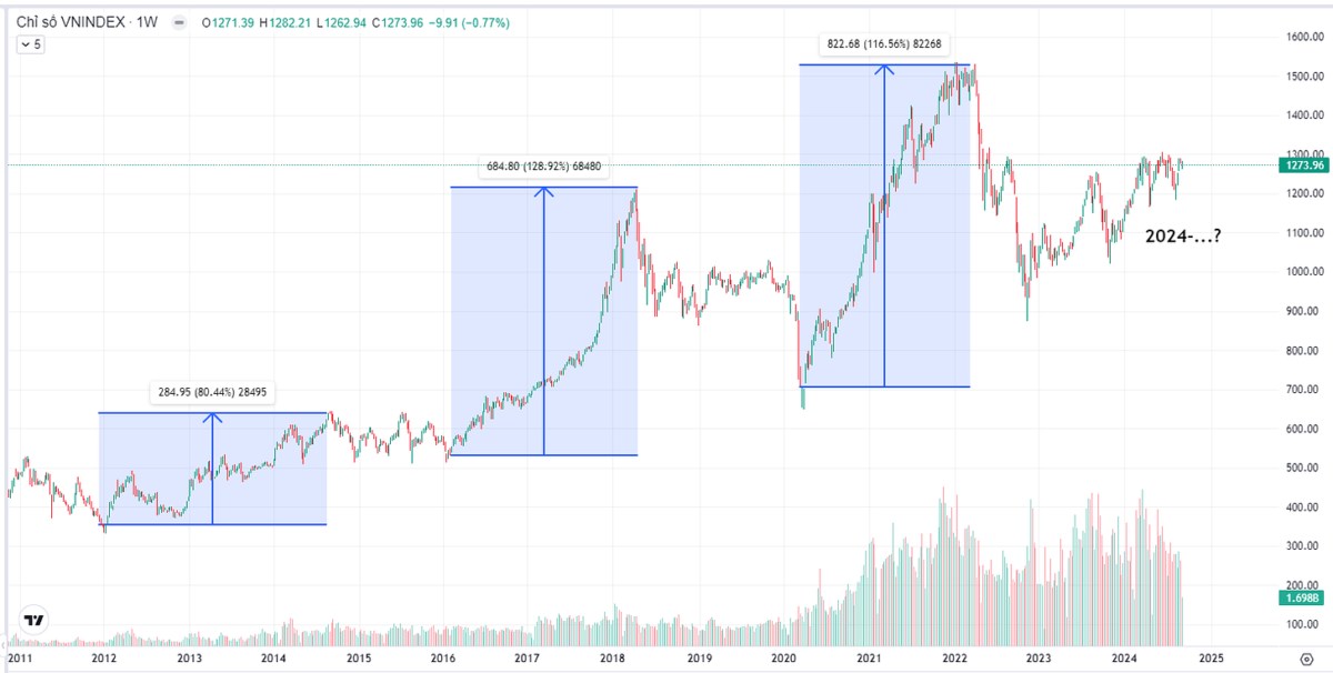 → Chỉ số VNINDEX( trung bình của phần lớn các cổ phiếu trên thị trường) tăng từ 80-130%, điều này cũng tương đương với việc phần lớn các cổ phiếu tăng 3-10 lần trong những giai đoạn đó.
