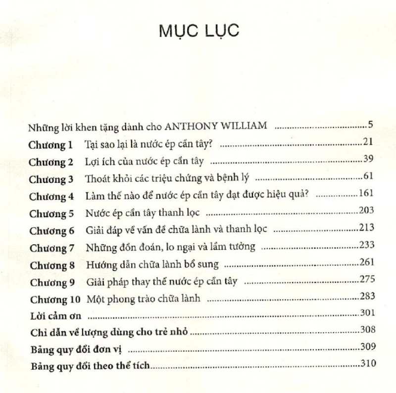 Với cuốn sách này, bạn đọc sẽ biết được cách uống nước ép cần tây sao cho biến nó trở thành suối nguồn thanh lọc thật sự. Ví dụ như trước khi uống nước ép cần tây mỗi sáng trong suốt qúa trình thanh lọc, bạn có thể tuỳ chọn uống nước chanh vàng hoặc chanh cốm hoặc nước trắng trước ngay khi thức dậy. Và toàn bộ quá trình thanh lọc phải diễn ra trong ít nhất 30 ngày. Bên cạnh đó, tác giả Anthony William cũng đưa ra một số giải pháp thay thế nước ép cần tây để mọi người linh hoạt áp dụng.
