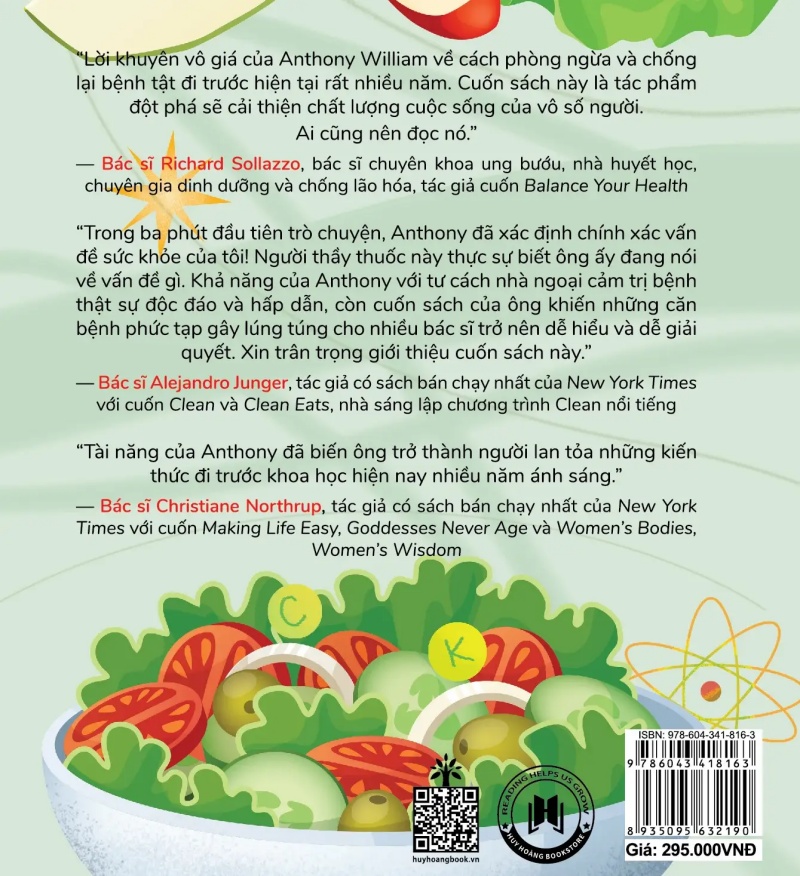 “Lời khuyên vô giá của Anthony William về cách phòng ngừa và chống lại bệnh tật đi trước hiện tại rất nhiều năm. Cuốn sách này là tác phẩm đột phá sẽ cải thiện chất lượng cuộc sống của vô số người. Ai cũng nên đọc nó.” - Bác sĩ Ricchard Sollazzo, bác sĩ chuyên khoa ung bướu, nhà huyết học, chuyên gia dinh dưỡng và chống lão hóa, tác giả cuốn Balance Your Heath.