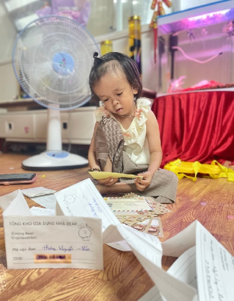 Trong một lần đi khu vui chơi, cô bé mê tít chiếc xe điện mini ở đó. Về nhà em lên mạng tìm chỗ bán, nhưng giá tới 4 triệu đồng. Để mua được nó, suốt mùa Tết năm 2022 ngày nào em cũng cặm cụi ngồi dán mũ ông Công ông Táo. "Phải ngồi một chỗ, tay chân dính keo và mũ ông Táo ngất tưởng muốn che kín người em luôn", Hằng nhớ lại.
