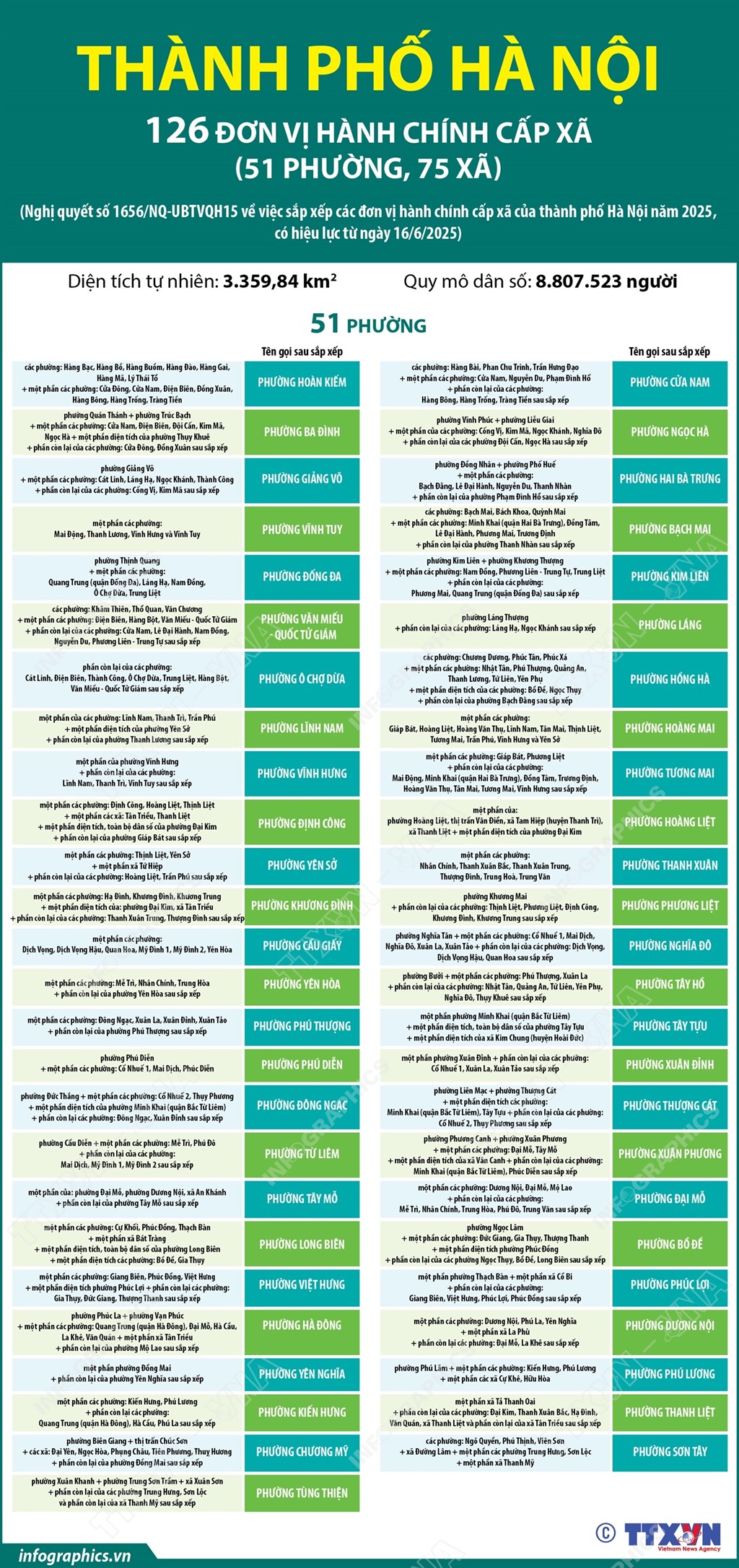 Theo Nghị quyết số 1656/NQ-UBTVQH15 ngày 16/6/2025 của Ủy ban Thường vụ Quốc hội, sau khi sắp xếp, thành phố Hà Nội có 126 đơn vị hành chính cấp xã, gồm 51 phường và 75 xã.