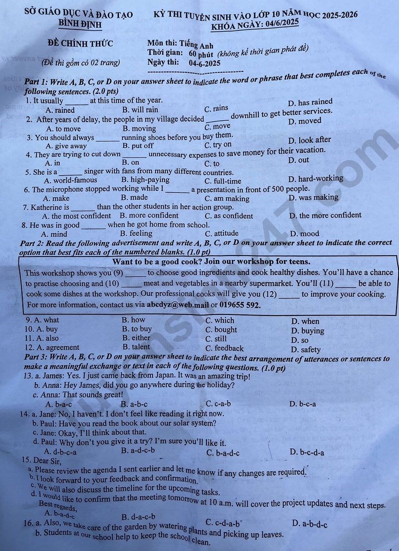 Đề thi vào lớp 10 năm 2025 môn Tiếng Anh tại Bình Định. Nguồn ảnh: tuyensinh247