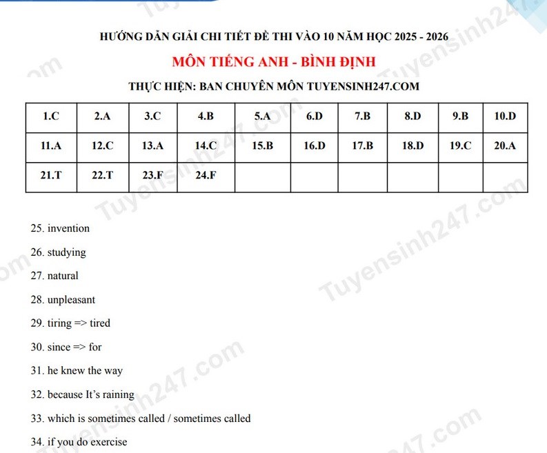 Đáp án đề thi vào lớp 10 năm 2025 môn Tiếng Anh tại Bình Định. Nguồn ảnh: tuyensinh247