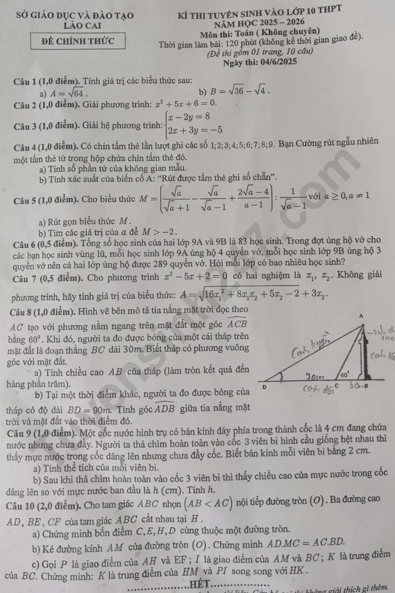 Đề thi vào lớp 10 năm 2025 môn Toán tại Lào Cai