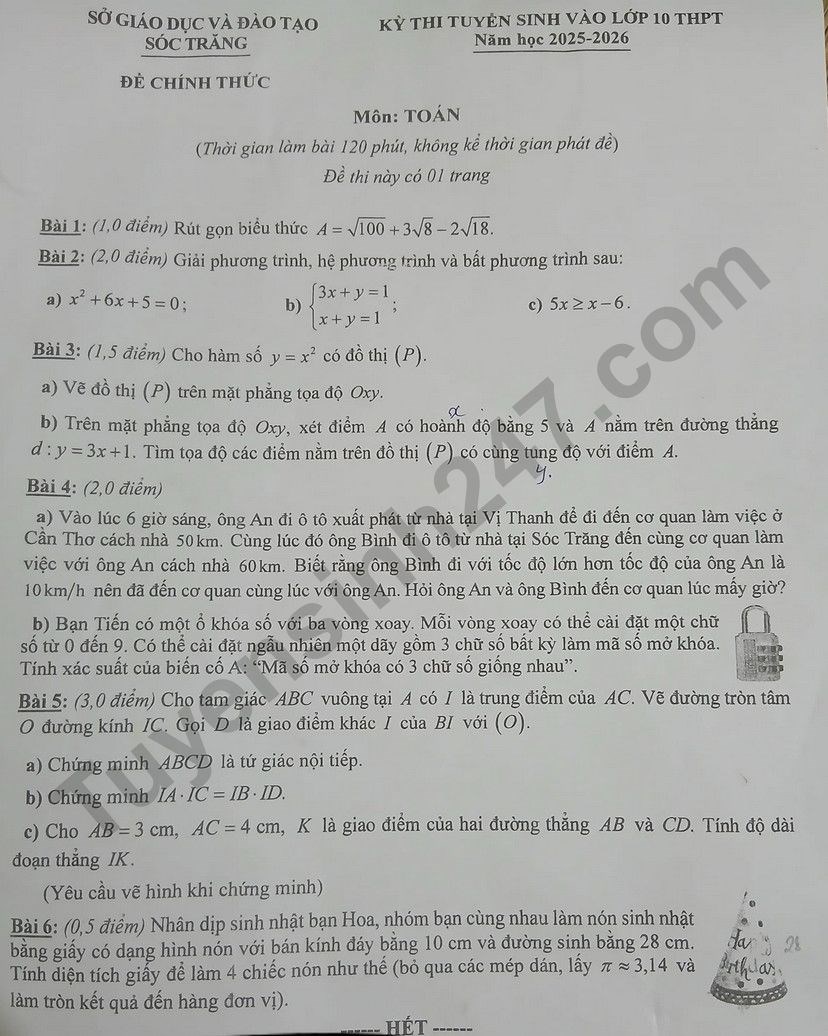 Đề thi vào lớp 10 năm 2025 môn Toán tại Sóc Trăng. Nguồn ảnh: tuyensinh247