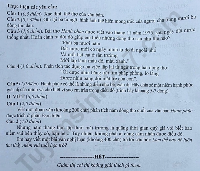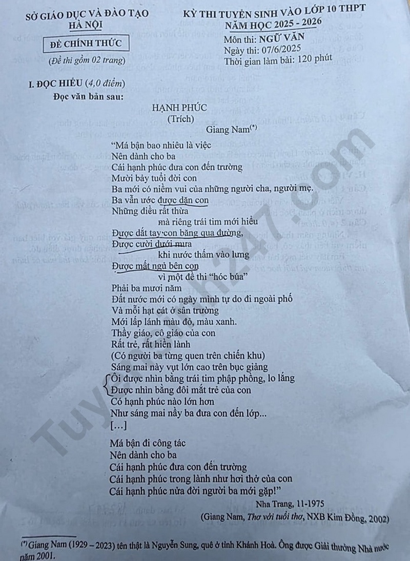 Đề thi vào lớp 10 năm 2025 môn Văn tại Hà Nội. Nguồn ảnh: tuyensinh247