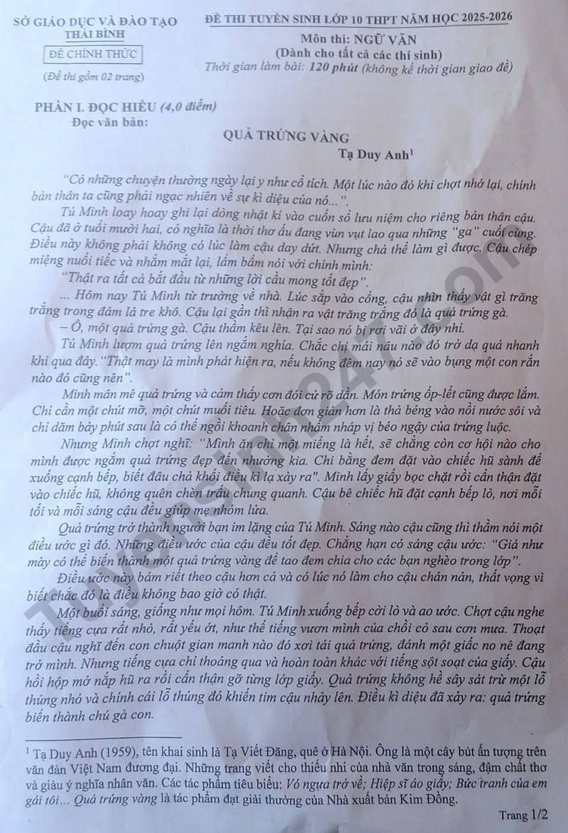 Đề thi môn Văn lớp 10 năm 2025 tại Thái Bình