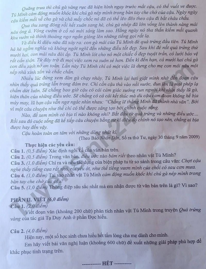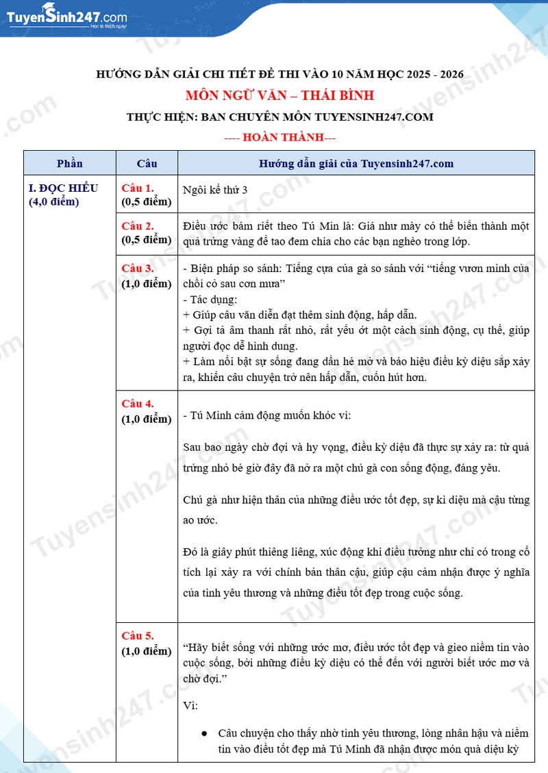 Đáp án đề thi môn Văn lớp 10 năm 2025 tại Thái Bình