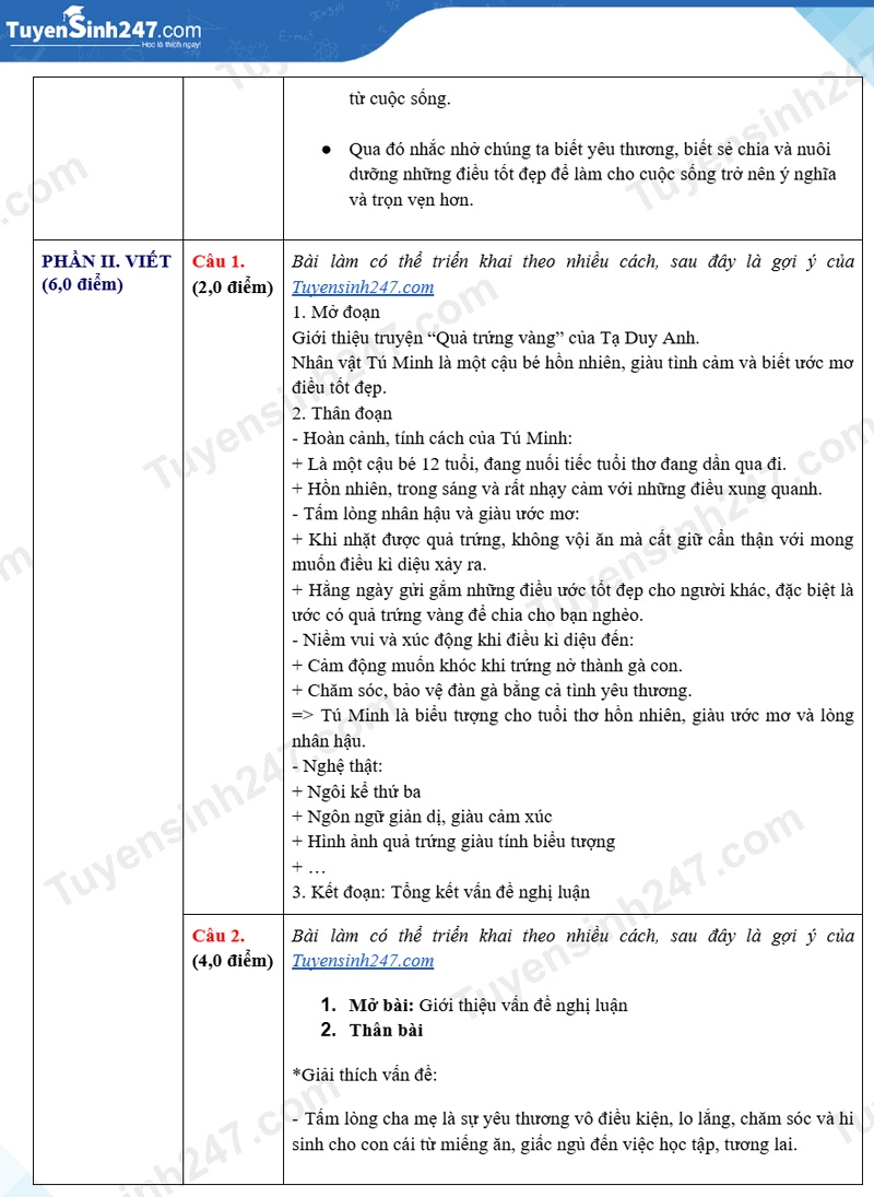 Gợi ý đáp áp đề thi môn Văn lớp 10 năm 2025 tại Thái Bình được thực hiện bởi Ban chuyên môn Tuyensinh247. Hướng dẫn giải đề thi Văn lớp 10 tại Thái Bình 2025 mang tính tham khảo.
