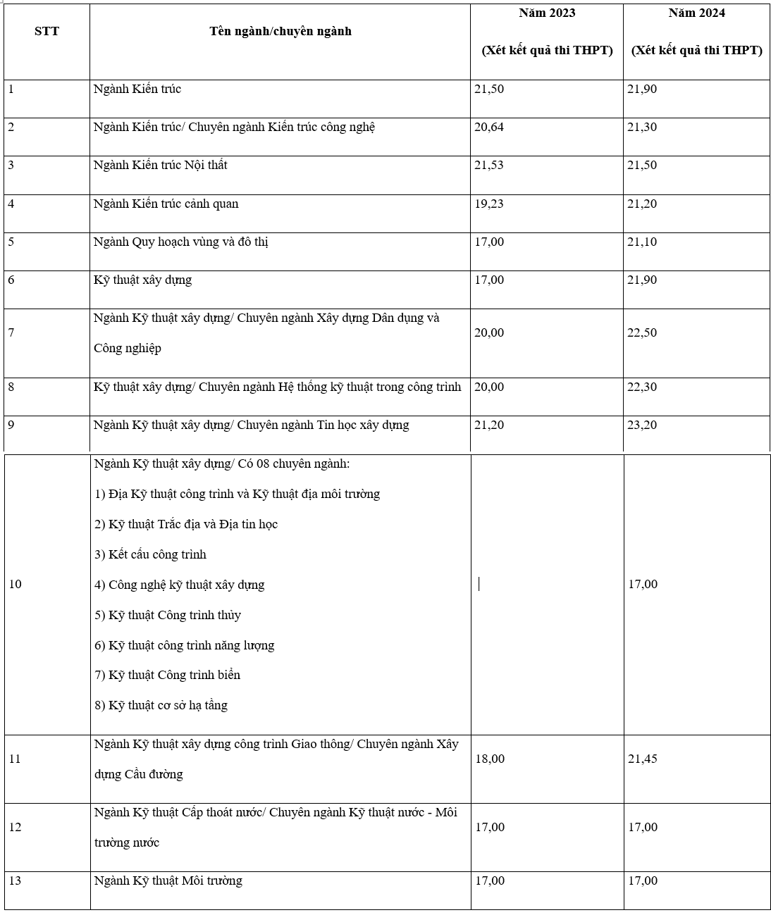Dưới đây là điểm chuẩn Đại học Xây dựng Hà Nội 2 năm gần nhất