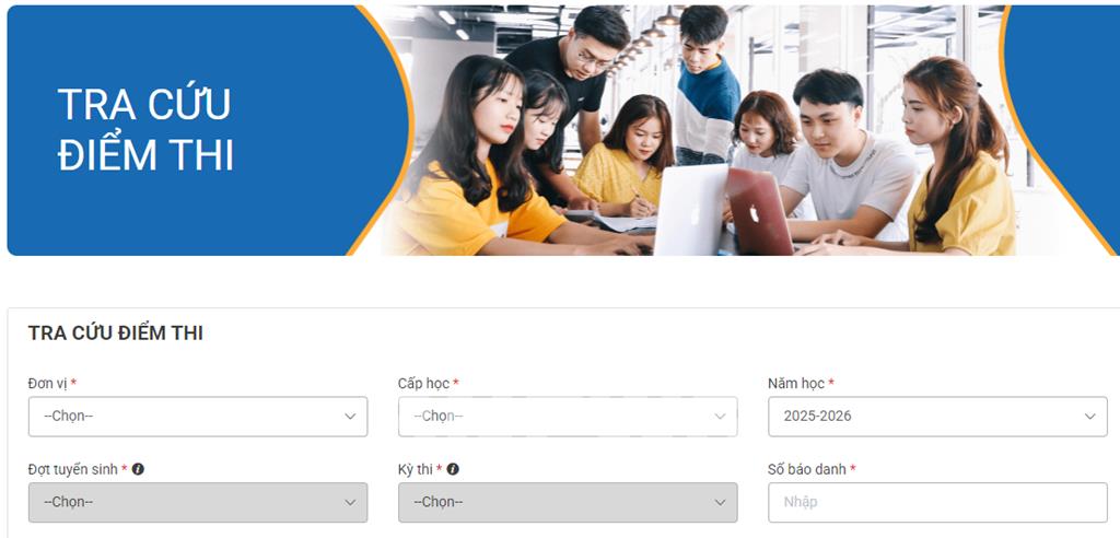 - Bước 2: Sau khi truy cập thành công, chọn Cấp học, Đợt tuyển sinh, Kỳ thi và điền Số báo danh