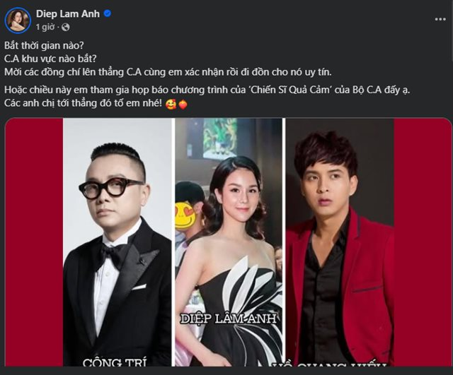 Đáp trả tin đồn, Diệp Lâm Anh bức xúc viết: “Bắt thời gian nào? Công an khu vực nào bắt? Mời các đồng chí lên thẳng công an cùng em xác nhận rồi đi đồn cho nó uy tín. Hoặc chiều nay em tham gia họp báo chương trình của "Chiến sĩ quả cảm" của Bộ Công an đấy ạ. Các anh chị tới thẳng đó tố em nhé!”.