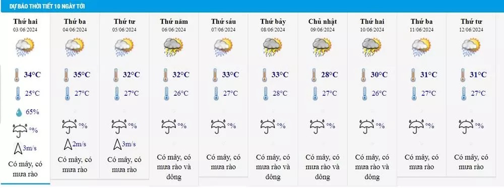 Có mây, ngày nắng, chiều tối và đêm có mưa rào và giông vài nơi. Gió tây nam cấp 2-3. Trong mưa giông có khả năng xảy ra lốc, sét, mưa đá và gió giật mạnh.