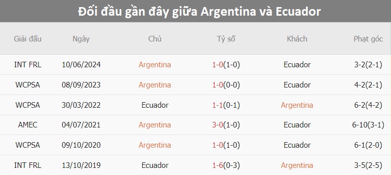 Tỷ lệ châu Á (0:1): Argentina chỉ thắng Ecuador 3/10 cuộc đối đầu trước đó theo tỷ lệ châu Á. Argentina thắng 7/10 trận gần đây (hoà 2, thua 1), trong khi Ecuador chỉ thua 2/9 trận mới nhất (thắng 5, hoà 2).