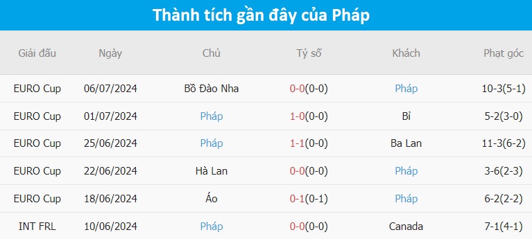 Hành trình lọt vào bán kết của Pháp tiếp tục tỏ ra kém thuyết phục. Họ phải cần đến loạt luân lưu mới loại được Bồ Đào Nha ở tứ kết và trước đó chỉ thắng Bỉ với tỷ số sít sao. Việc chỉ ghi 3 bàn sau 5 trận từ đầu Euro 2024 (2 trong số này là phản lưới nhà) khiến Les Bleus bị nghi ngờ lớn về khả năng toả sáng trước Tây Ban Nha. Điều tích cực về sự chắc chắn trong phòng ngự có thể giúp Pháp giảm bớt mối đe doạ tấn côn đáng sợ từ đối thủ.