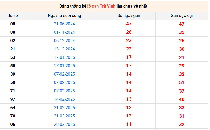 Bảng thống kê lô gan Trà Vinh lâu về nhất 23/5/2025