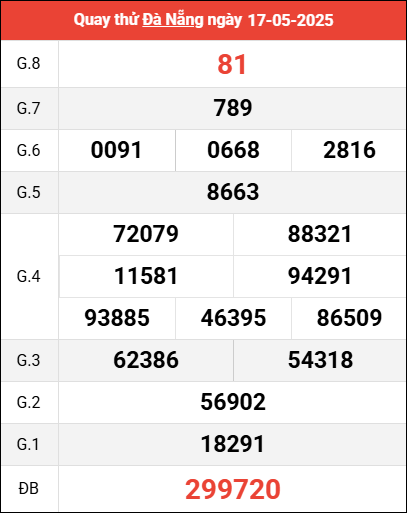 Mời các bạn xem lại bảng kết quả kỳ trước với giải đặc biệt, giải tám, lô tô 2 số để có thể đưa ra nhận định dự đoán DNG ngày 17 tháng 5 năm 2025 chuẩn xác nhất