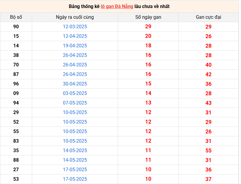 Bảng thống kê lô gan Đà Nẵng 25/6/2025