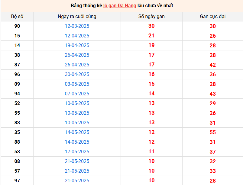 Bảng thống kê lô gan Đà Nẵng lâu về nhất 28/6/2025